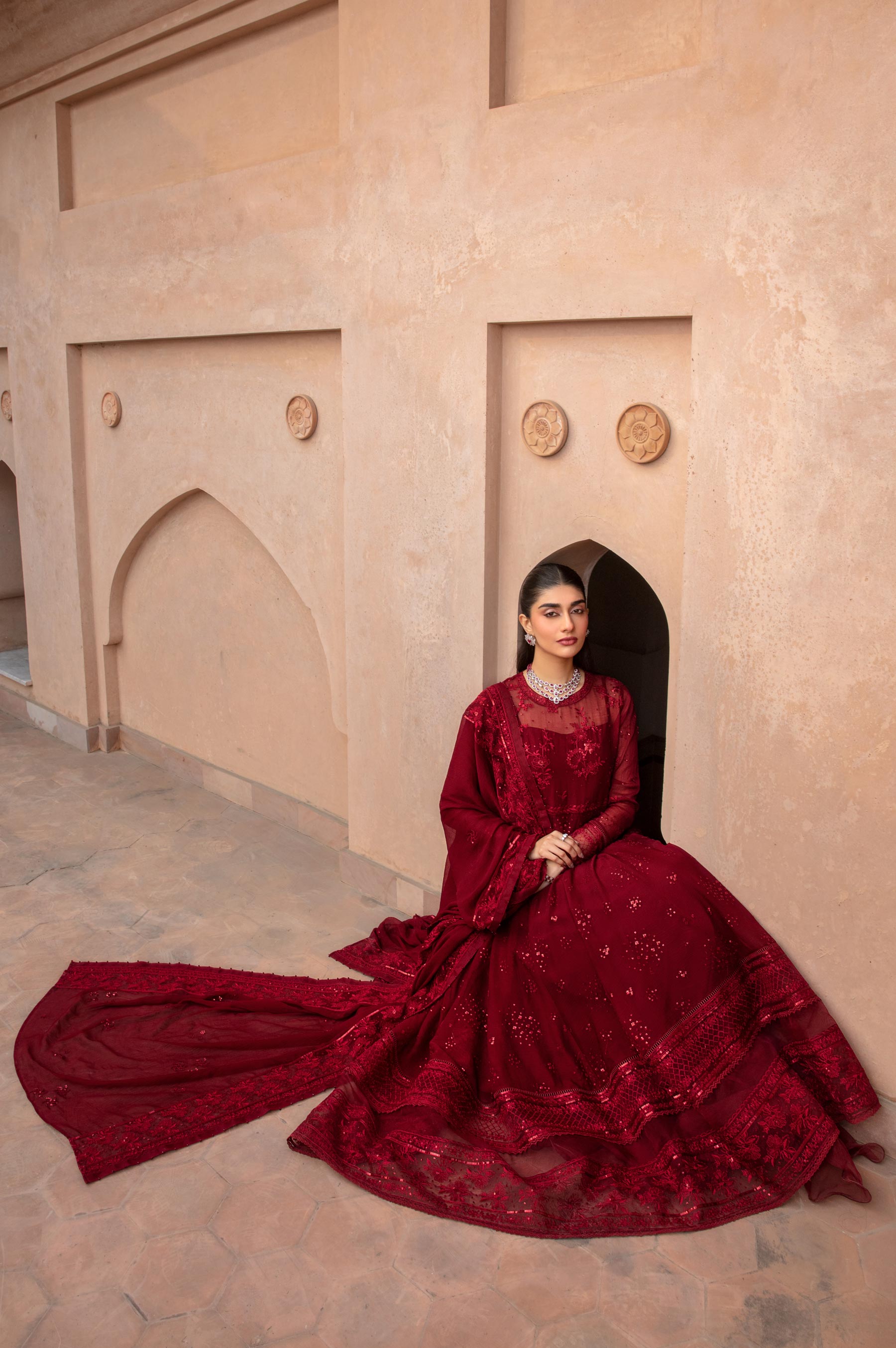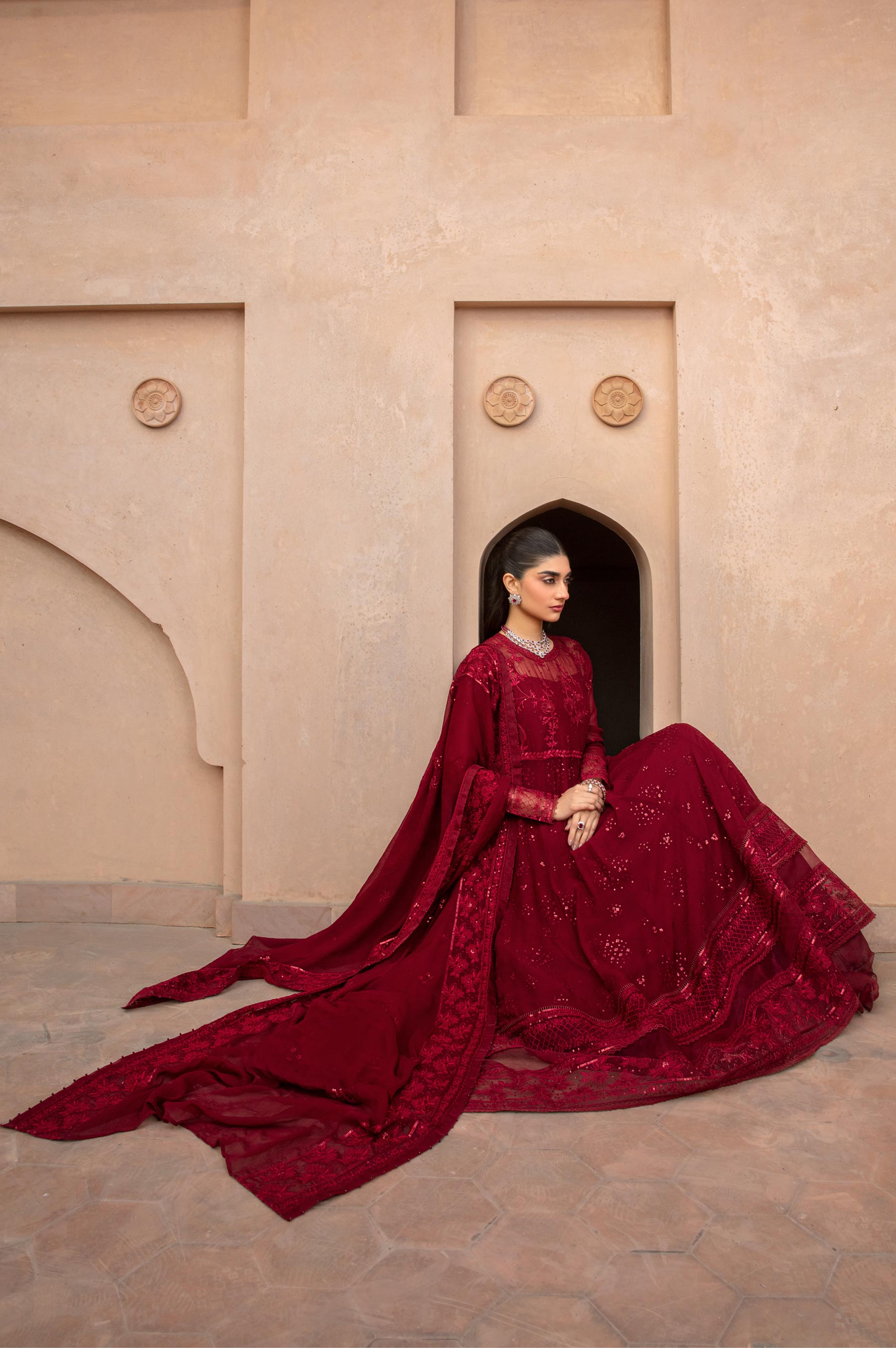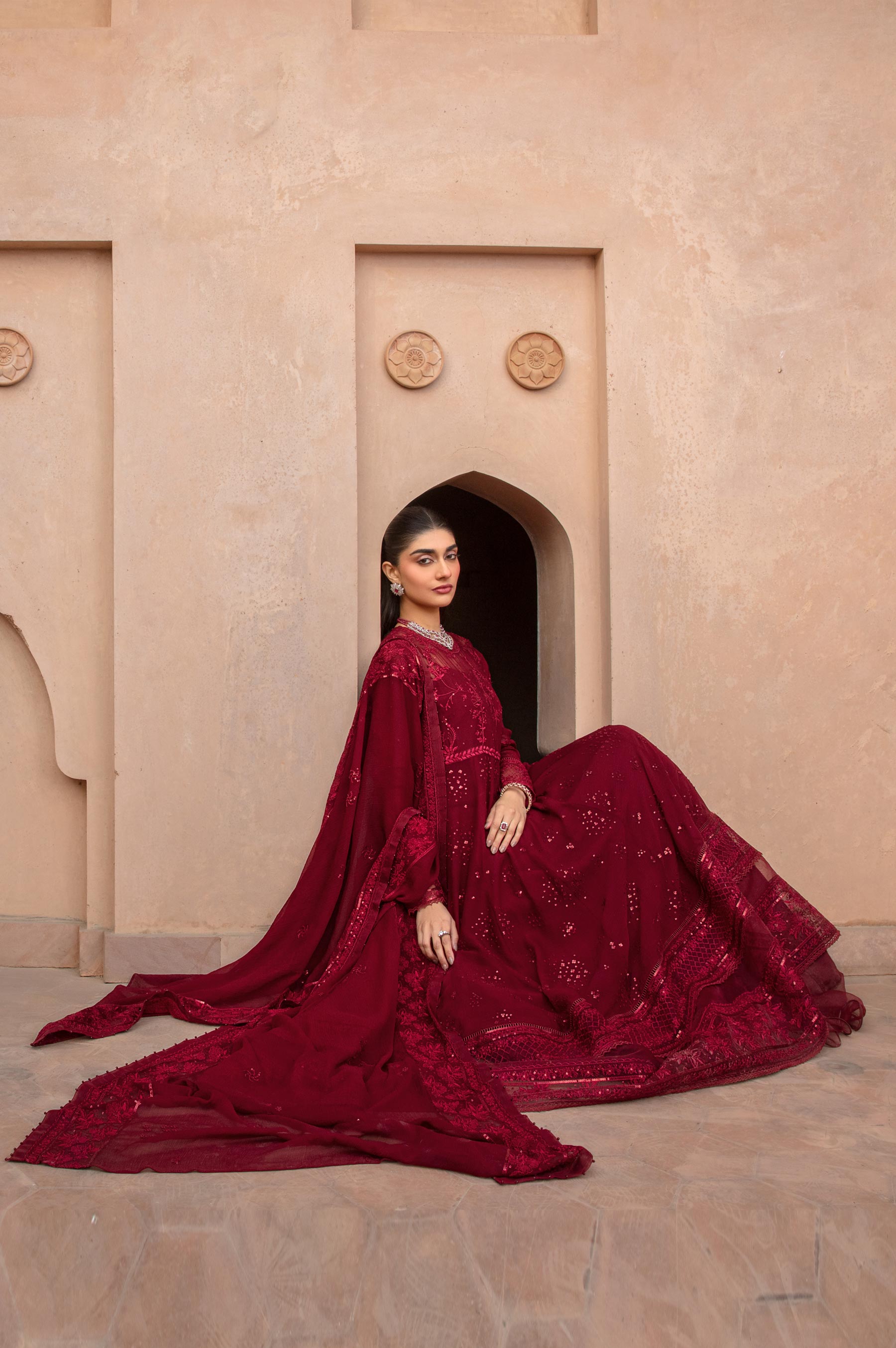 Merlot reigns supreme in this exquisite 3-piece embroidered chiffon suit, boasting rich maroon oak hues that exude regality. The design is a masterpiece, inspired by sequins spray and French florals gracing the pishwas with a bodice. Adding a touch of sophistication, the lehenga features organza frills, while the Sequins All Over embroidered dupatta with Organza Finishing completes the ensemble. A perfect formal attire, it's ideal for the festive season, radiating elegance and charm.
